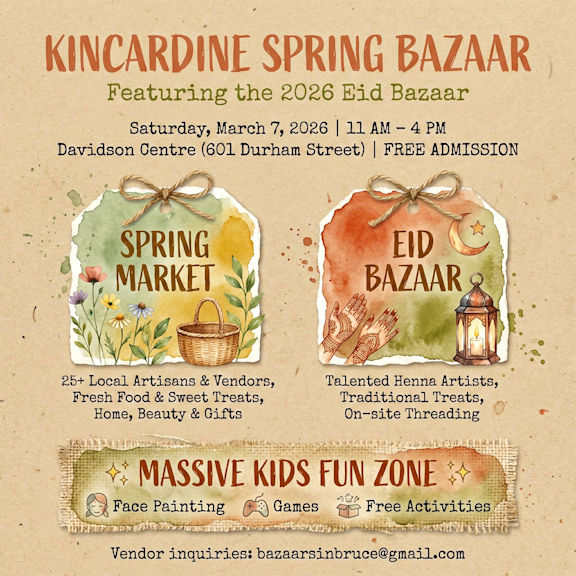 The Kincardine Spring Market and Eid Bazaar will be held Saturday, March 7, from 11 a.m. to 4 p.m., at the Davidson Centre in Kincardine.
