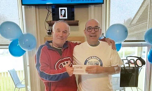 Doug Holtby (below, left, with Russ Crook) of Kincardine is $500 richer as the first Early Bird winner in the Kin Cares 50/50 Draw.